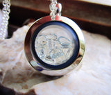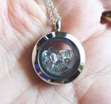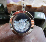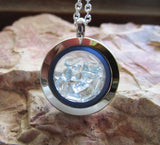 I added beautiful faceted aquamarine gemstone crystals to a double sided silver floating locket. This comes with a 24 inch 925 silver filled chain. A very sparkly and eye-catching necklace that is sure to attract attention. The stainless steel bezel is 20mm in diameter and unscrews to open. The aquamarine gemstones are various sizes and shapes. They are pale blue in color and are from Pakistan. Aquamarine means "water of the sea". It is a blue or turquoise variety of beryl.
