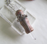 I used a turned beechwood spindle and attached natural quartz crystal points to each end. I wired an oxidized silver plated dagger to the wand with square gunmetal wire and added a tiny Swarovski blood red crystal to it. This comes with a 24 inch oxidized silver plated chain.