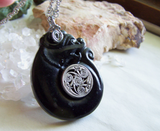 I attached a swirl silver cabochon to a black jade spiral dragon pendant. This comes with a 24 inch antiqued silver plated chain.