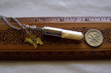 A recycled 32 caliber silver bullet shell casing holds a butterscotch striped agate crystal point. I capped the bullet with a silver cone cap and added tiny gold plated butterflies to the bail. This comes with a 24 inch silver plated rope chain.