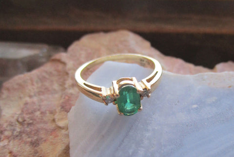 A vintage 10kt yellow gold ring with an oval emerald gemstone. There are two small diamonds or CZs on either side of the emerald. The faceted emerald is 6x4mm and is set in a basket type prong setting. The emerald may be lab grown. The ring is marked 10K and has a maker's mark of EMA. It is a size 6 and is in excellent vintage condition. It weighs 1.8 grams. Emerald is the birthstone for May.