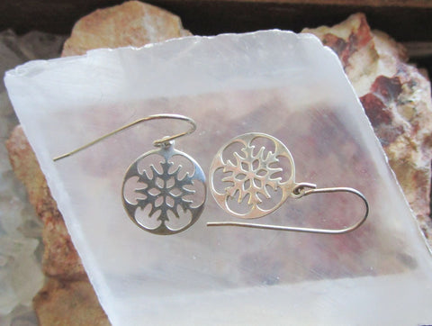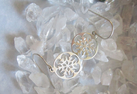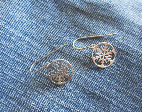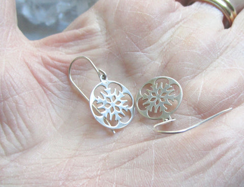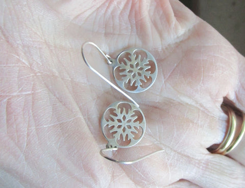 A vintage pair of sterling silver snowflake earrings. They feature a cutout snowflake pattern inside a circular frame. The snowflakes are 14mm in diameter. The earring wires and the snowflakes are 925 sterling silver. They are very light weight and comfortable to wear.